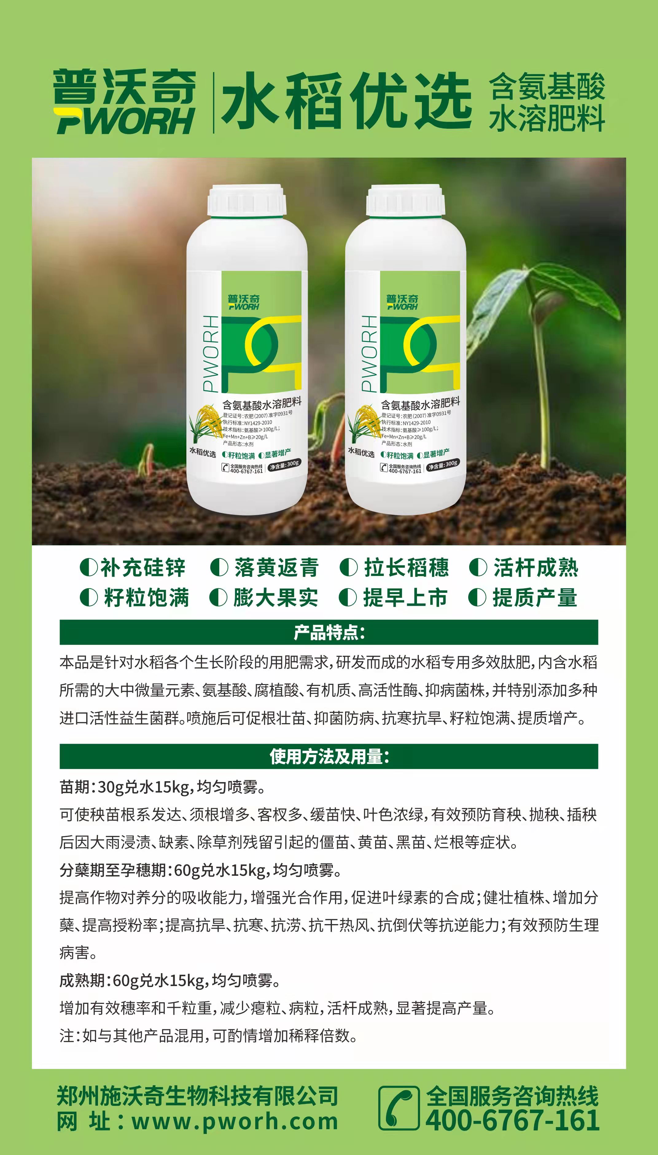 本品是针对水稻各个生长阶段的用肥需求,研发而成的水稻专用多效肽肥,内含水稻所需的大中微量元素、氨基酸、腐植酸、有机质、高活性酶、抑病菌株,并特别添加多种进口活性益生菌群。喷施后可促根壮苗、抑菌防病、抗寒抗旱、籽粒饱满、提质增产。